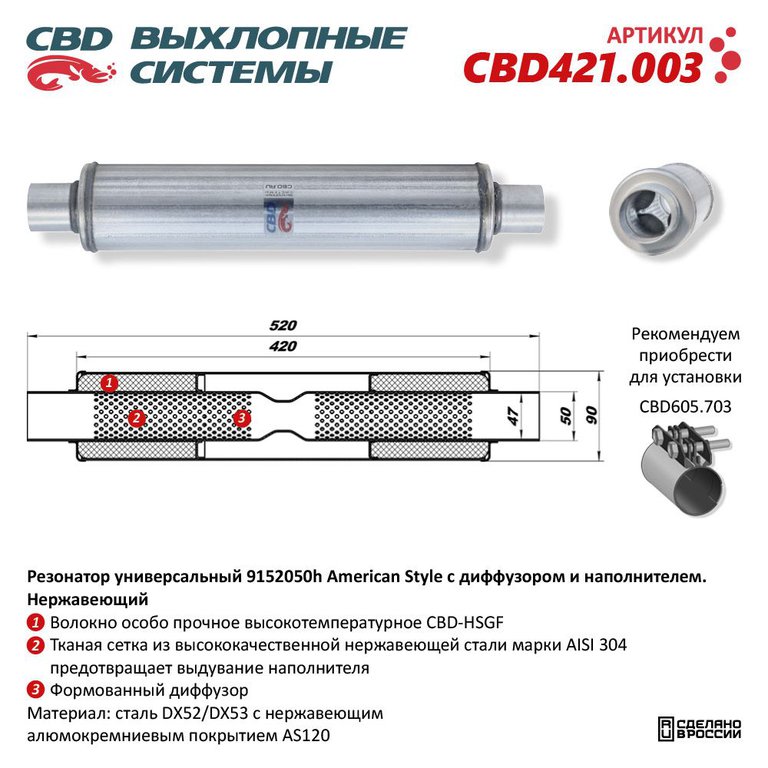 Резонатор универсальный d=47, L=520мм (внешн d=91мм) CBD