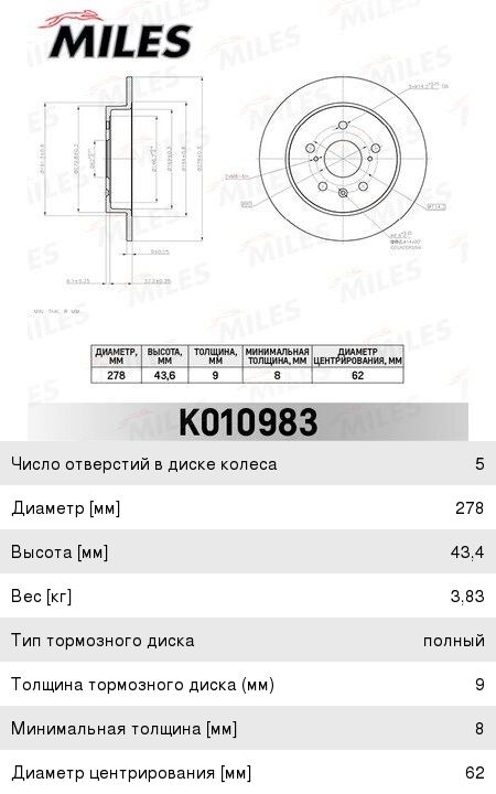 Диск тормозной SUZUKI SX4 (07-) задний (1шт.) MILES