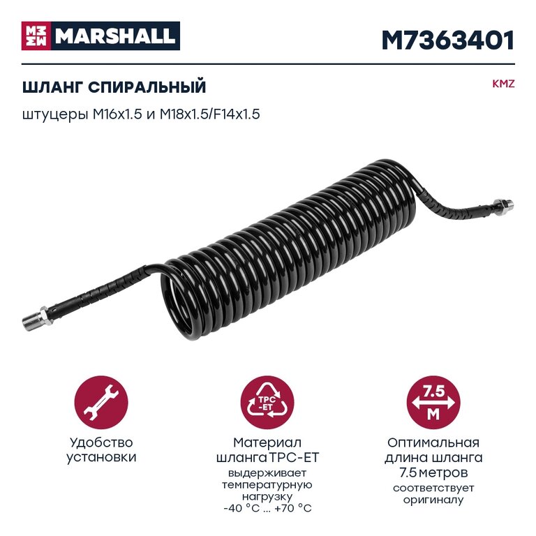 Шланг пневматический витой М16/18 L=7.5м (черный) КАМАЗ-5490 MARSHALL