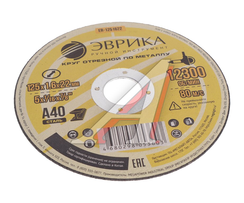 Круг отрезной по металлу 125х1.6х22.2мм А40 ЭВРИКА