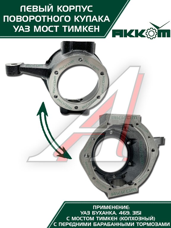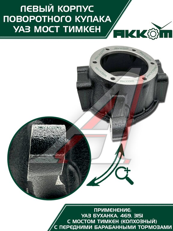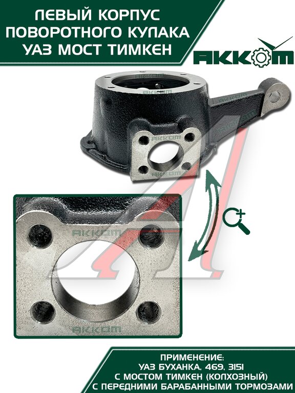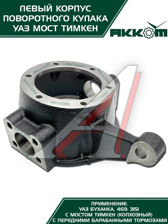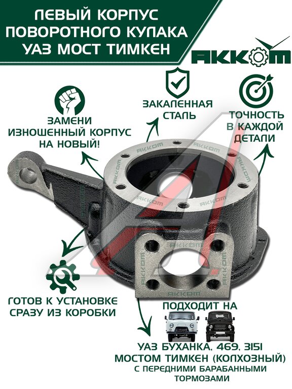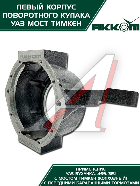 Корпус поворотного кулака УАЗ Буханка от АККОМ это надежное решение для левой стороны вашего автомобиля, предназначенное для моделей УАЗ Буханка и 469 с мостами Тимкен и передними барабанными тормозами. Если вы ищете долговечную замену, этот кулак поворотный УАЗ создан для вас. Он изготовлен из высококачественной закаленной стали, что обеспечивает повышенную прочность и устойчивость к серьезным нагрузкам на бездорожье. Точность в каждой детали гарантирует идеальную посадку и безупречную работу в ступичном узле, полностью соответствующую заводским стандартам. Данный поворотный кулак УАЗ 469 готов к установке сразу из коробки, что позволяет быстро и без лишних доработок заменить изношенный корпус на новый. Этот кулак УАЗ Буханка подходит для эксплуатации в самых суровых условиях, восстанавливая управляемость и безопасность вашего внедорожника. Установите проверенный корпус поворотного кулака УАЗ от АККОМ и верните своему УАЗу 469 или Буханке былую надежность.