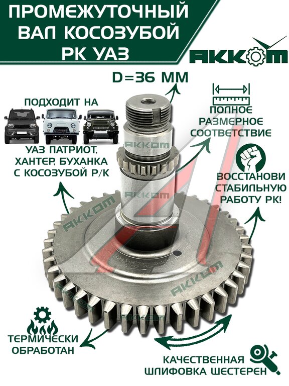 Вал промежуточный РК УАЗ от АККОМ для восстановления штатной работы вашего автомобиля. Данный вал промежуточный рк уаз предназначен для замены в раздаточных коробках моделей УАЗ с косозубой передачей. Это надежное решение для таких моделей, как УАЗ Патриот, Хантер и Буханка. Устанавливая наш вал раздатки уаз, вы выбираете качество и долговечность. Конструкция имеет увеличенный до 36 мм диаметр, что положительно сказывается на прочности и ресурсе всей трансмиссии. Промежуточный вал раздатки уаз от АККОМ проходит полный цикл контролируемого производства. Ключевое преимущество это термическая обработка, которая значительно повышает твердость металла и его стойкость к износу и высоким нагрузкам. После этого следует этап качественной шлифовки шестерен, что обеспечивает идеальную геометрию, плавность зацепления и минимальный уровень шума при работе. Мы гарантируем полное размерное соответствие оригинальным деталям, поэтому вал рк уаз легко устанавливается на штатное место без каких-либо доработок. Использование этого вала раздаточной коробки уаз позволит вам восстановить корректную работу трансмиссии, устранить вибрации и посторонние шумы. Обновите свою раздаточная коробка уаз с помощью проверенного компонента, который вернет ей стабильность и надежность на многие тысячи километров. Вал промежуточный рк уаз от АККОМ это разумный выбор для тех, кто ценит качество и хочет обеспечить своему внедорожнику бесперебойную работу в любых условиях.