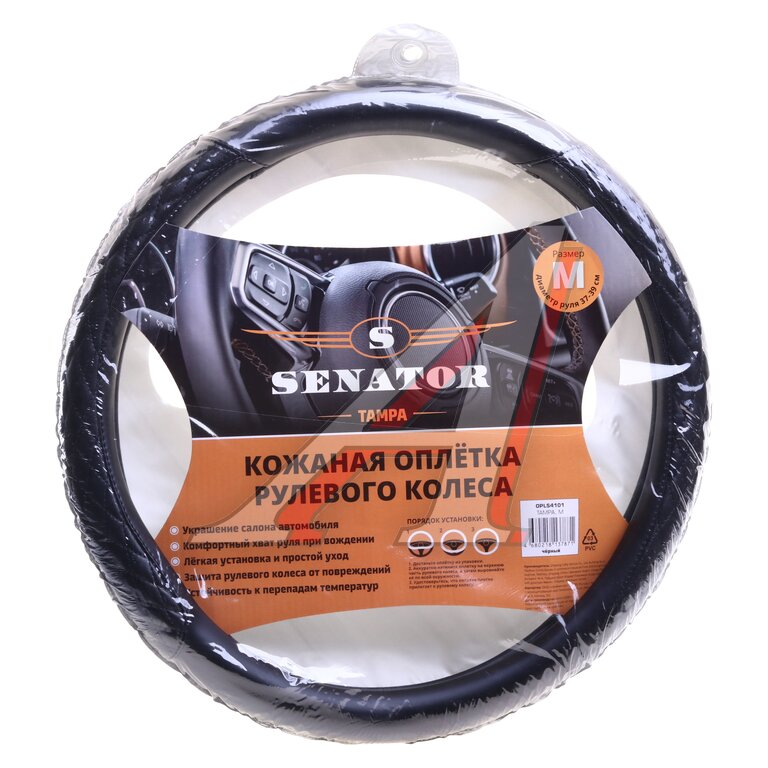 Оплетка руля (M) 37-39см черная экокожа/стеганая вставка Tampa SENATOR