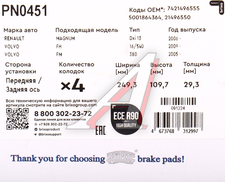Колодки тормозные VOLVO RENAULT дисковые (249x110x29мм) (4шт.) с р/к NIBK