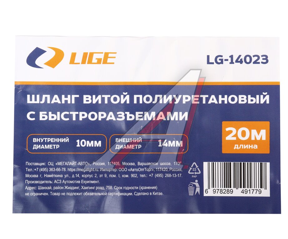Шланг компрессора 10х14мм 20м спиральный полиуретановый с быстроразъемами LIGE