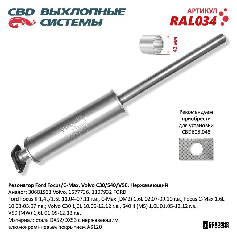 - Рекомендации: устанавливать с помощью универсальной прокладки CBD605.043