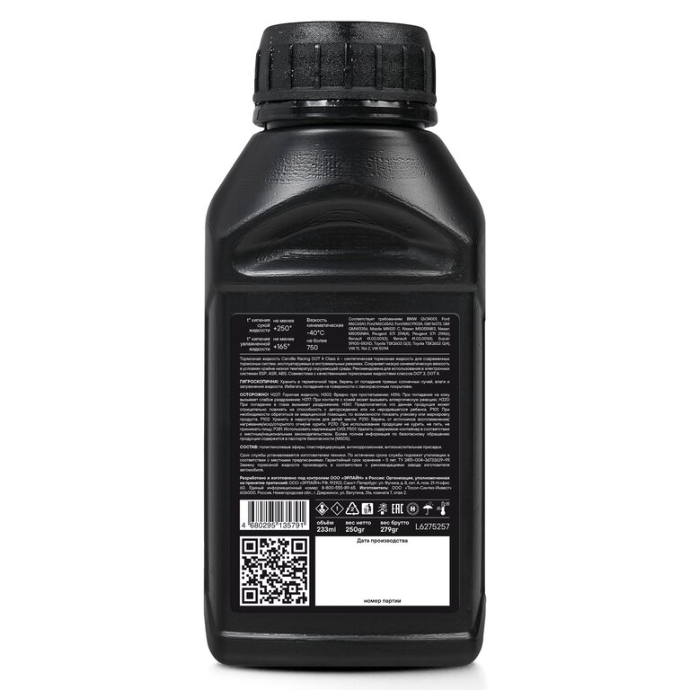 Тормозная жидкость Carville Racing DOT 4 предназначена для использования во всех гидравлических тормозных системах и приводах сцеплений, в которых рекомендовано применение жидкостей DOT 3 и DOT 4. Рекомендуемый срок замены каждые 2 года либо 40000 км пробега. Необходимо соблюдать предписанные производителем транспортного средства интервалы замены тормозной жидкости. Необходимо соблюдать предписания производителя транспортного средства по спецификации тормозной жидкости. ВНИМАНИЕ! Тормозная жидкость агрессивна по отношению к лакам, краскам и коже рук.