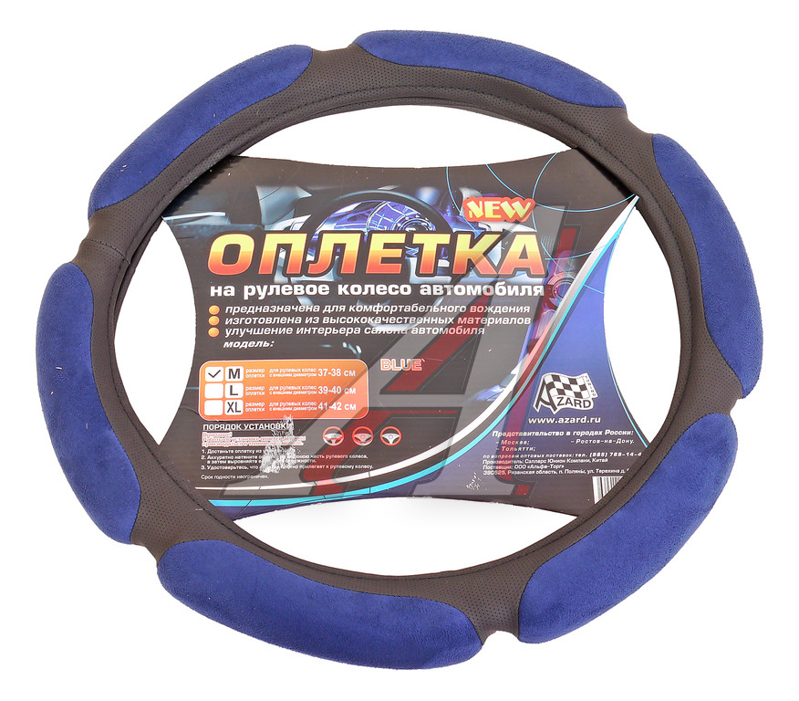 Оплетка руля (M) 37-39см синяя спонжевая (6 подушек) AZARD