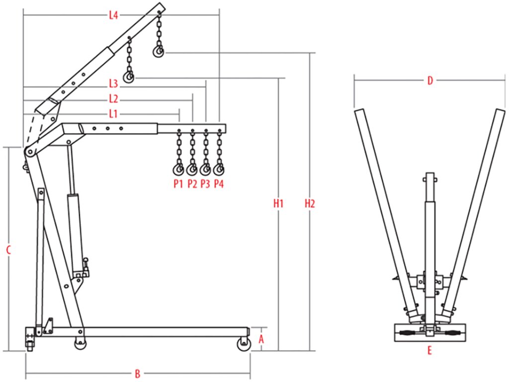 Гидравлический гаражный кран GTE-HK13001 с грузоподъемностью 1 тонна, предназначен для подъёма и перемещения тяжёлых узлов и агрегатов — двигателей, коробок передач, мостов и другого оборудования. Часто используется в автосервисах и гаражах.
