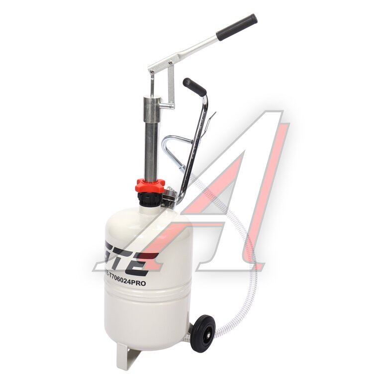 Установка для подачи масла GTE-T706024PRO с ручным приводом представляет собой стальную емкость объемом 24 л, c ручкой для удобства перемещения в помещении автосервиса, оборудована ручным насосом, который создает давление, необходимое для подачи масла и сходных материалов.