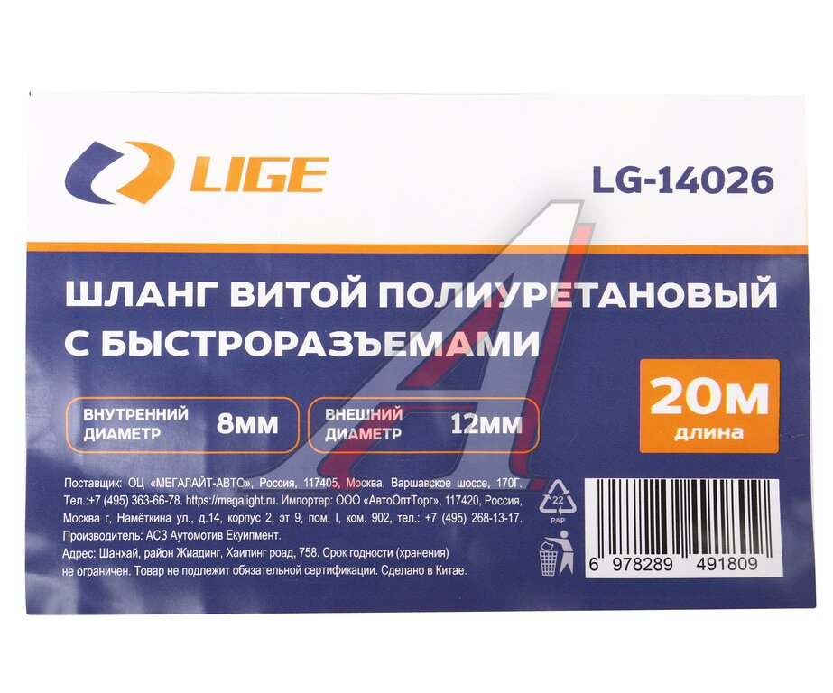 Шланг компрессора 8х12мм 20м спиральный полиуретановый с быстроразъемами LIGE